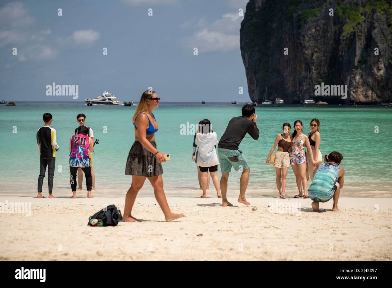 Krabi Thailand 9th Apr 2022 Tourists Take Pictures At Maya Bay Whose Beach Was Made Famous By The Movie The Beach Staring Leonardo Dicaprio In The 1990 S Known As A Popular International